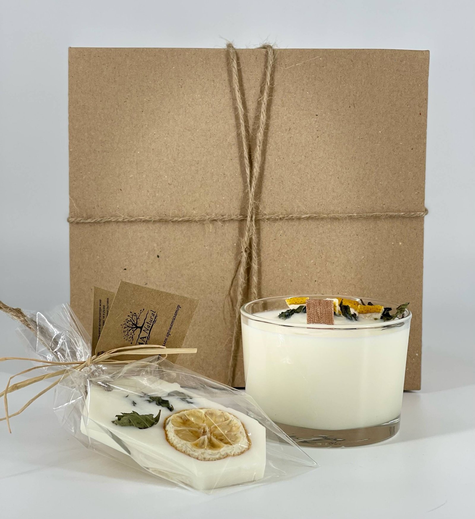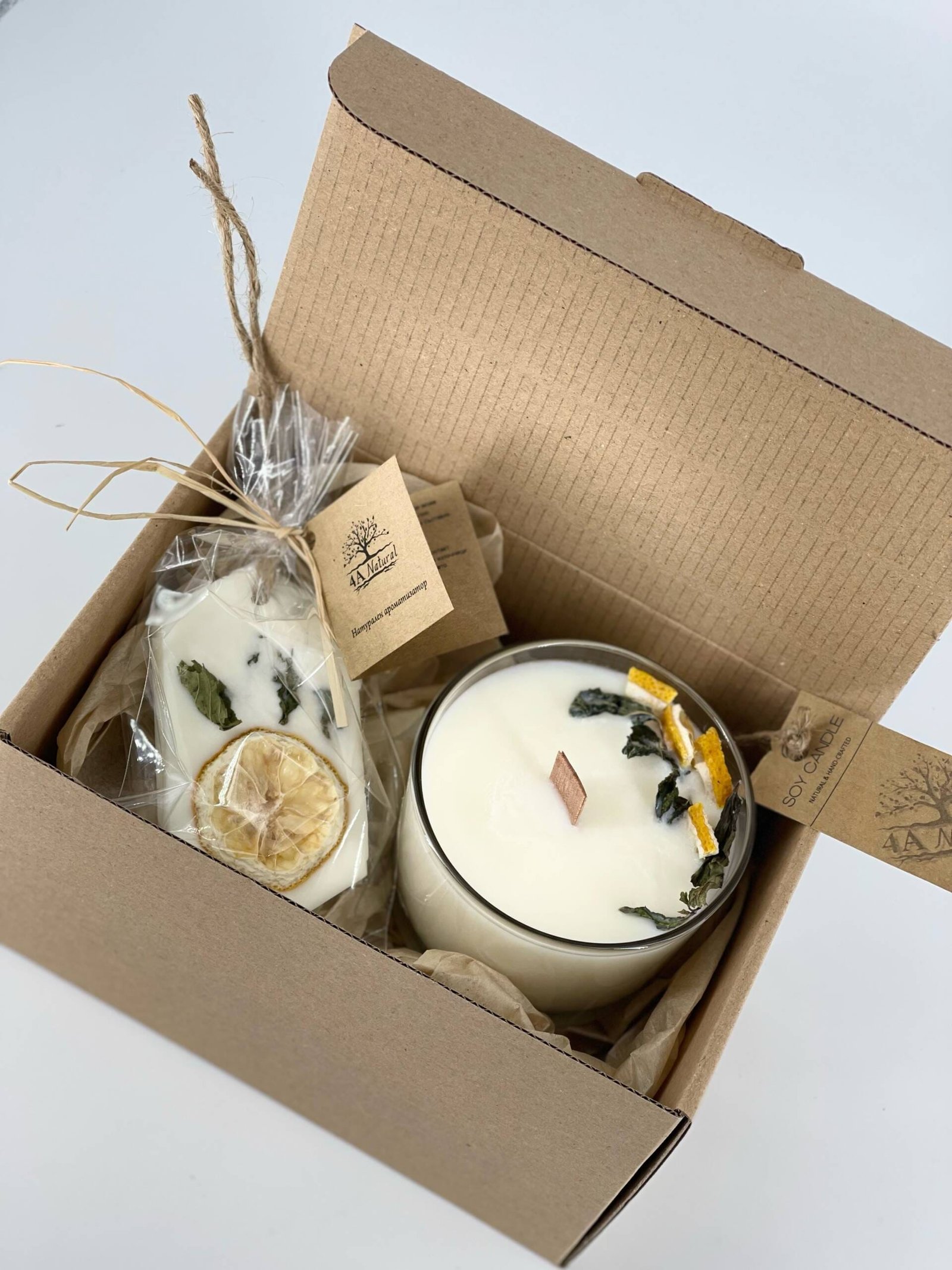 Комплект натурална соева свещ с дървен фитил и ароматизатор, ръчно изработени, ароматизирани с етерични масла лимон и мента. Подаръчно опаковани.