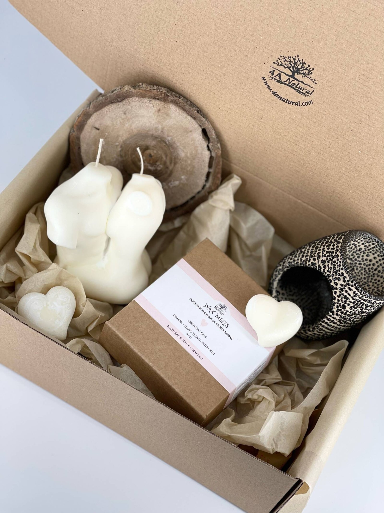 Подаръчен комплект за любим човек. Ръчно изработени соева свещ и восъчни фигурки с арома лампа. Ароматизирани с етерични масла жасмин, иланг, пачули.
