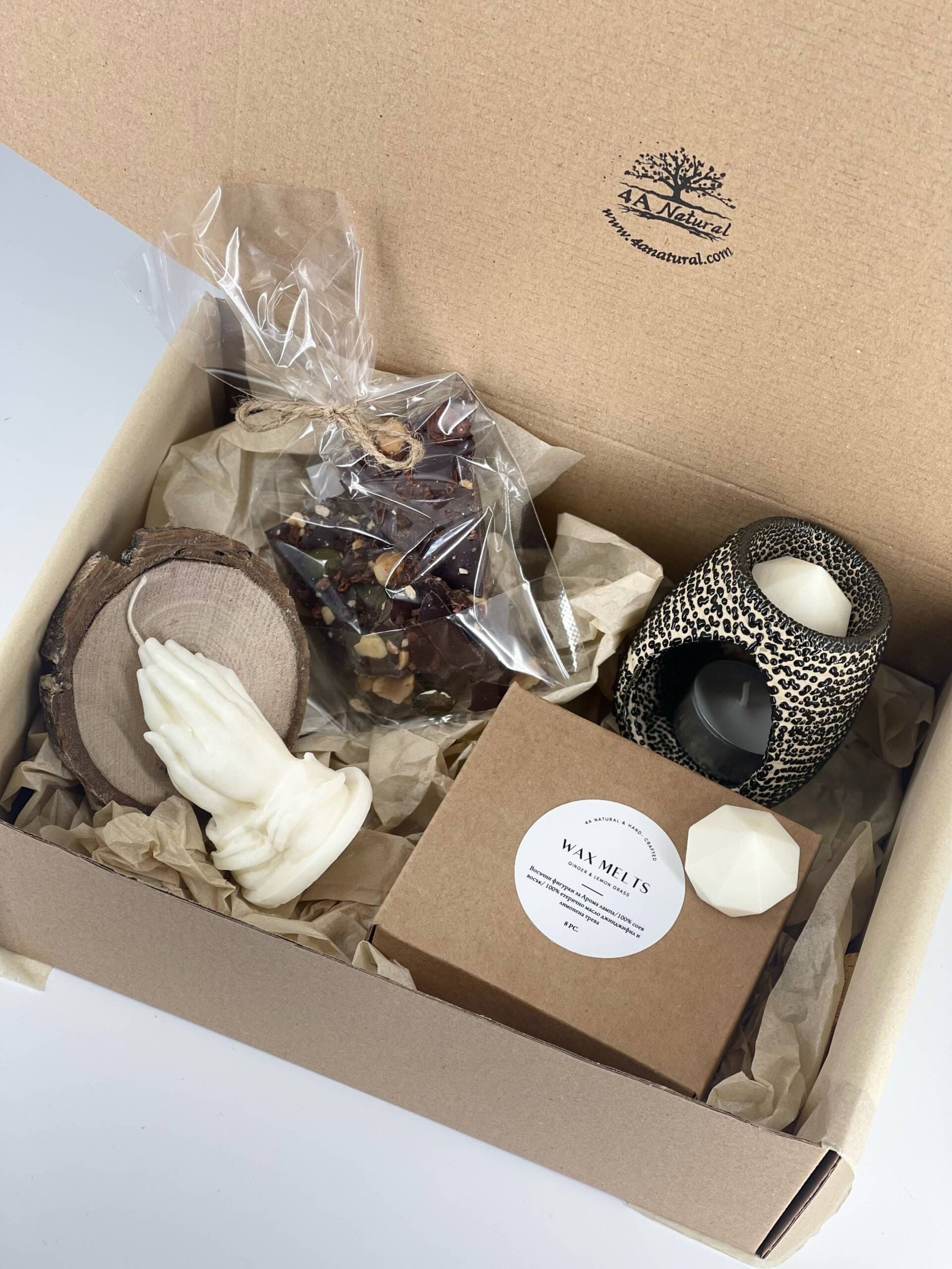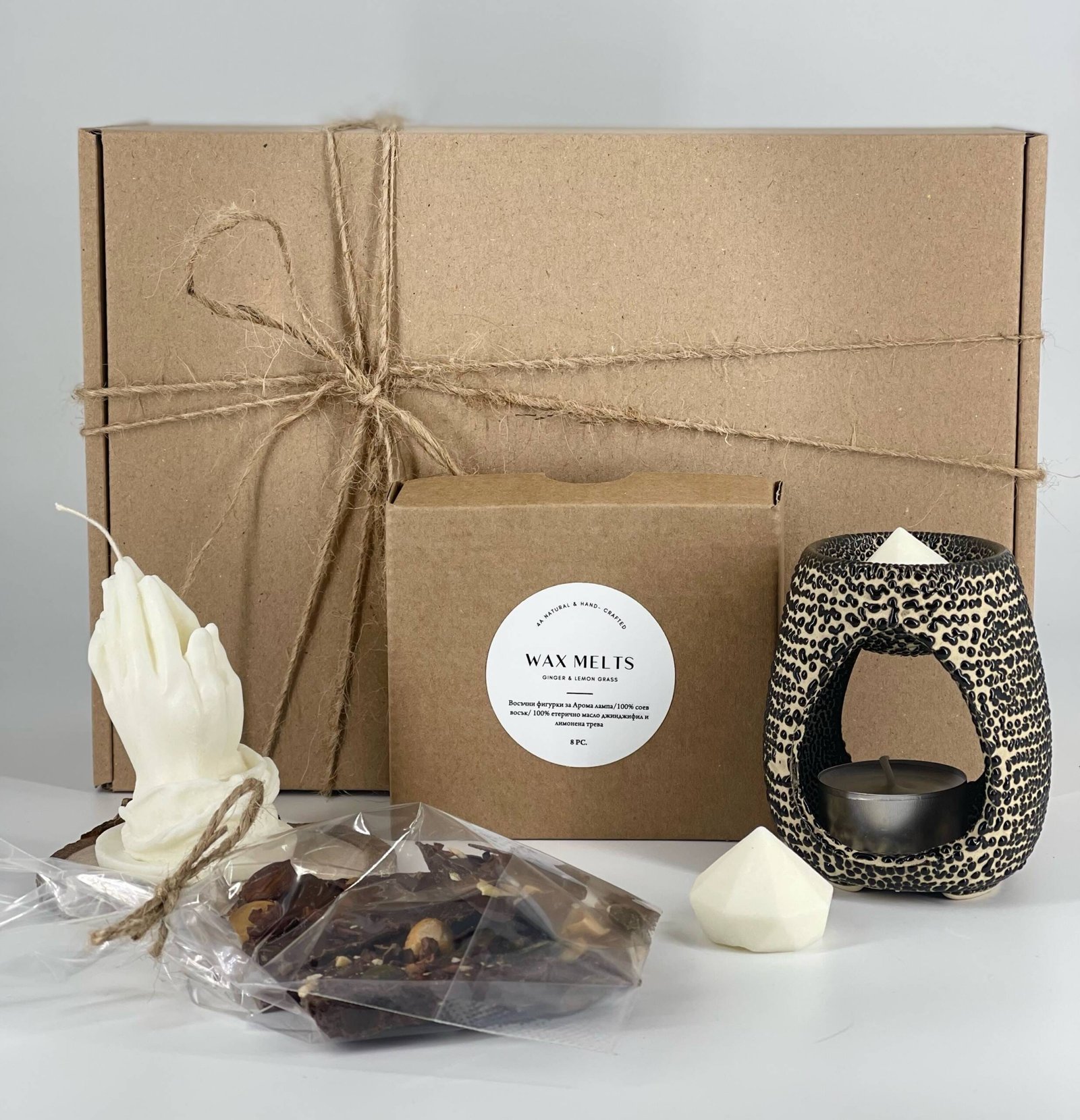 Кутия с 8 броя соеви восъчни фигурки, ароматизирани с етерични масла Джинджифил и Лимонова трева.