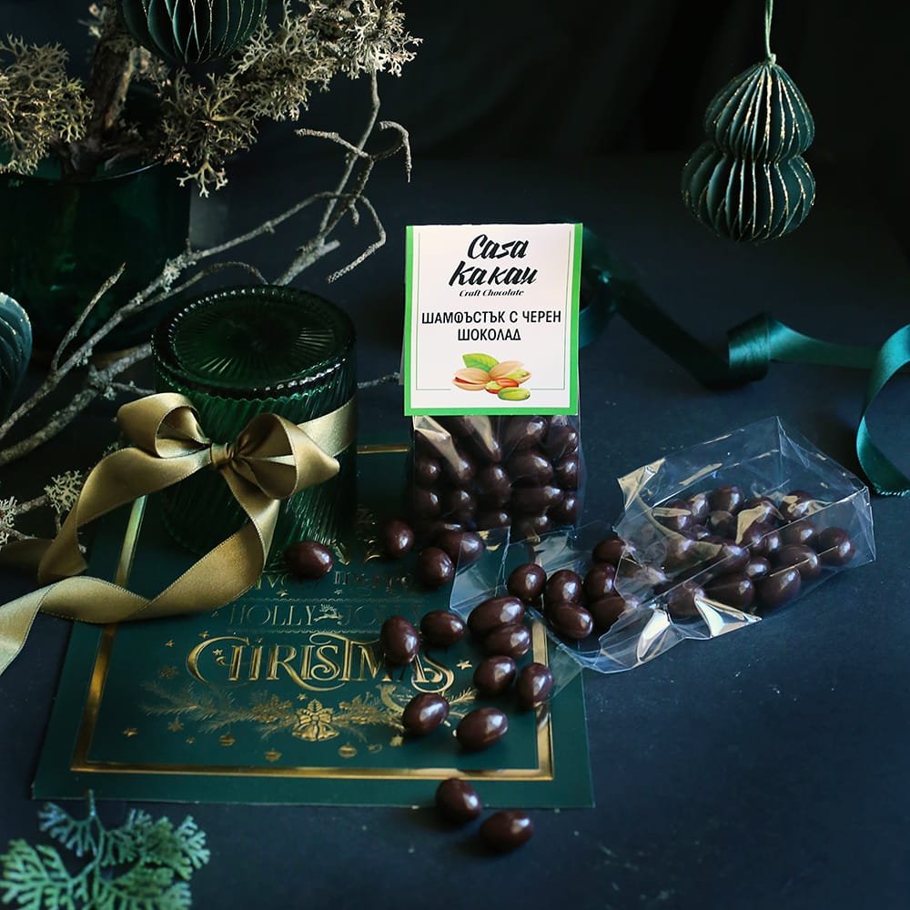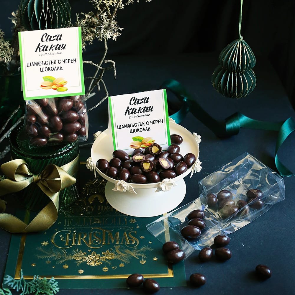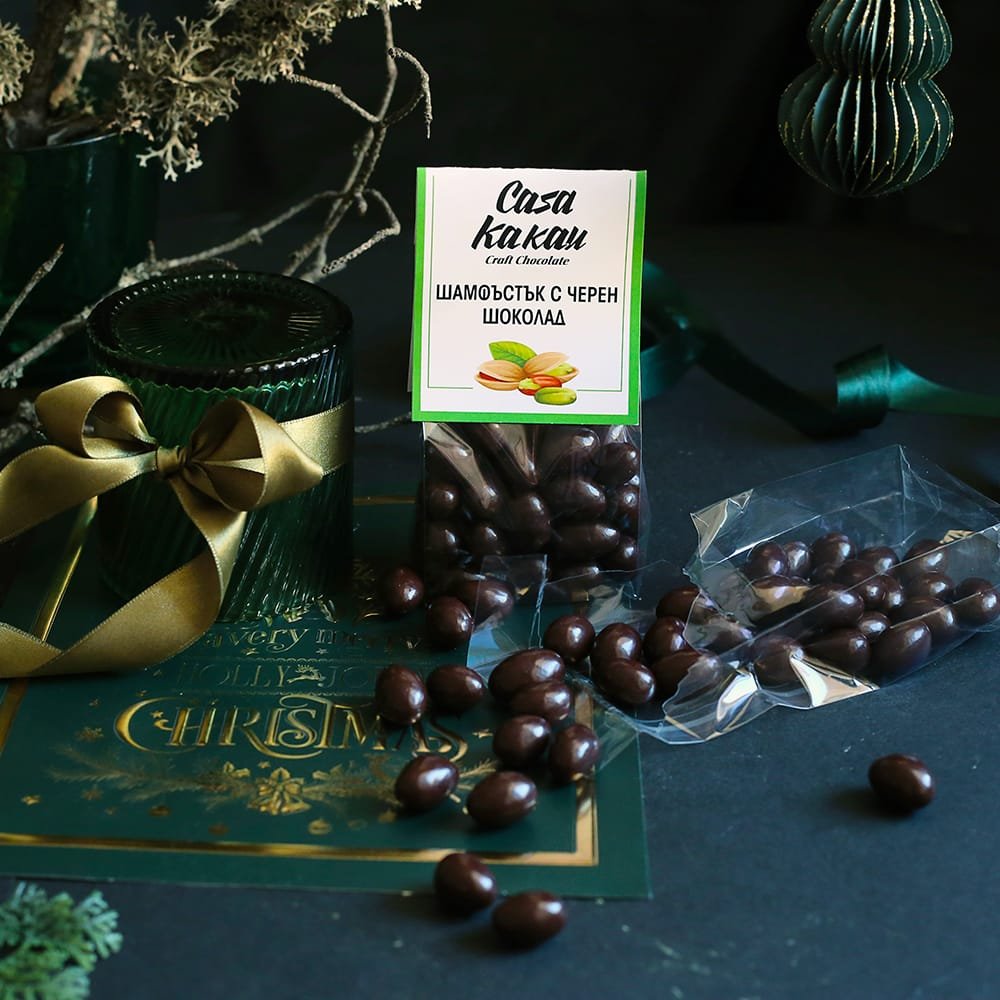 Свежи, неустоими и изключително вкусни, това са веган, безглутенови, шоколадови дражета, ръчно приготвени с голямо внимание и любов. Съдържащи първокласни, белени ядки шамфъстък, покрити с черен шоколад, те са идеални за споделяне, по време на път или като бърз източник на енергия и тонус.