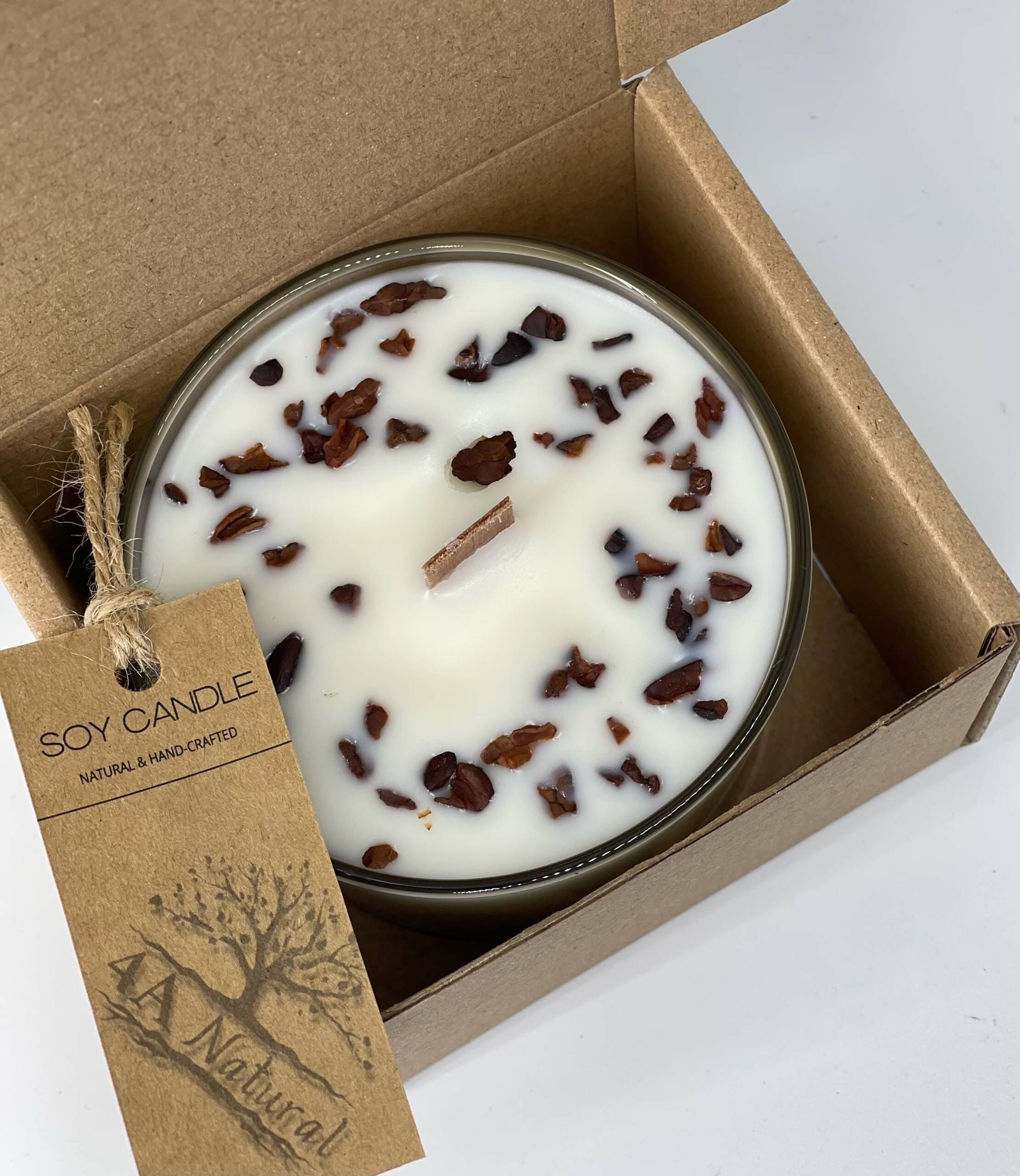 Натурална соева свещ ръчно излята в стъклен съд, с двоен дървен фитил и ароматизирана с натурално масло отт какао и от пачули, декорирана с какаови люспи. 200гр. до 40ч. горене