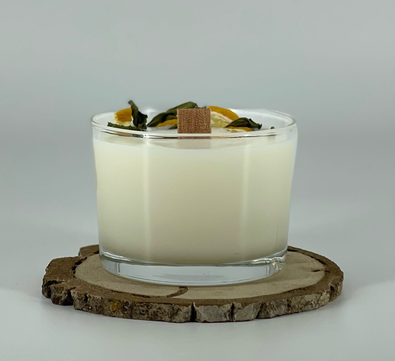 Натурална соева свещ ръчно излята в стъклен съд, с двоен дървен фитил и ароматизирана с етерично масло мента и лимон, декорирана със сушени лимонени корички и листенца мента. 200гр. до 40ч. горене