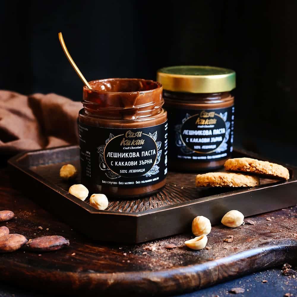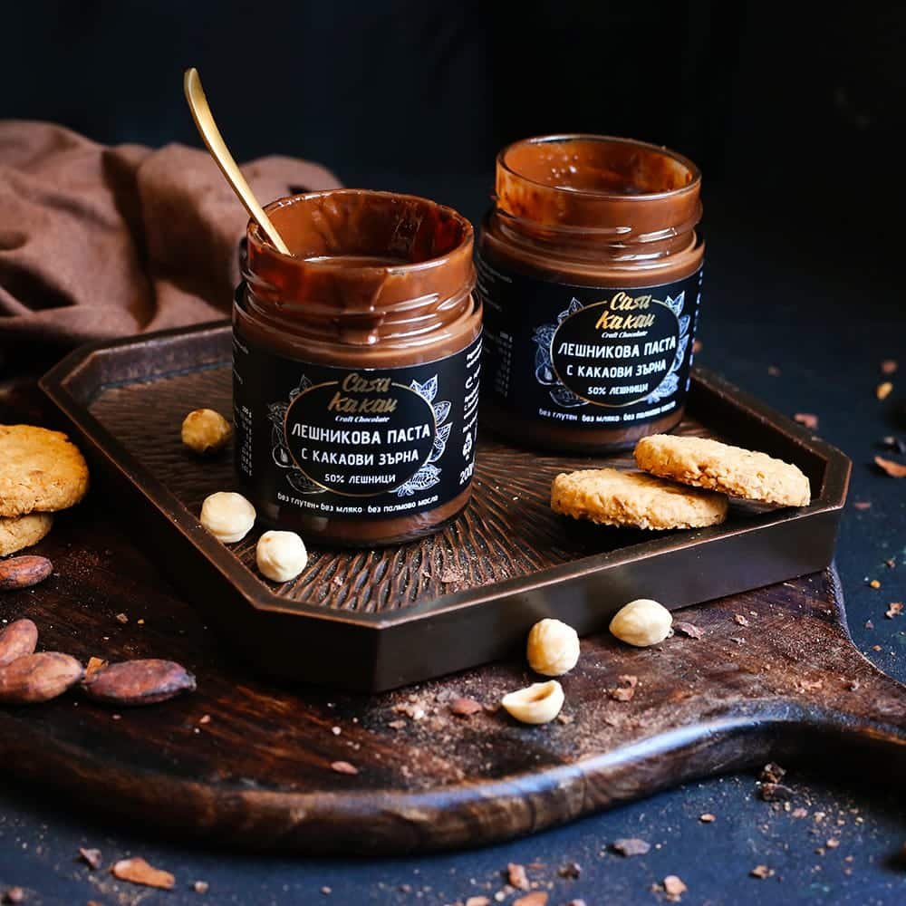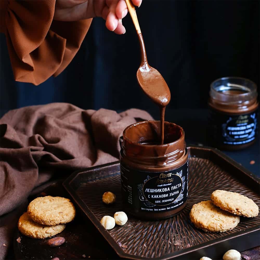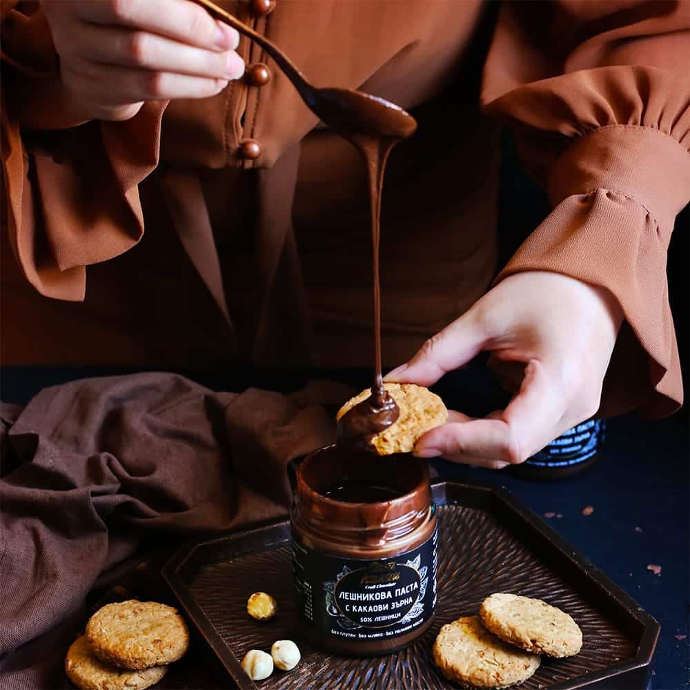 Съставки: лешници 35%, кафява тръстикова захар, кокосово масло, какао на прах 10%, кокосово мляко на прах, ванилия.